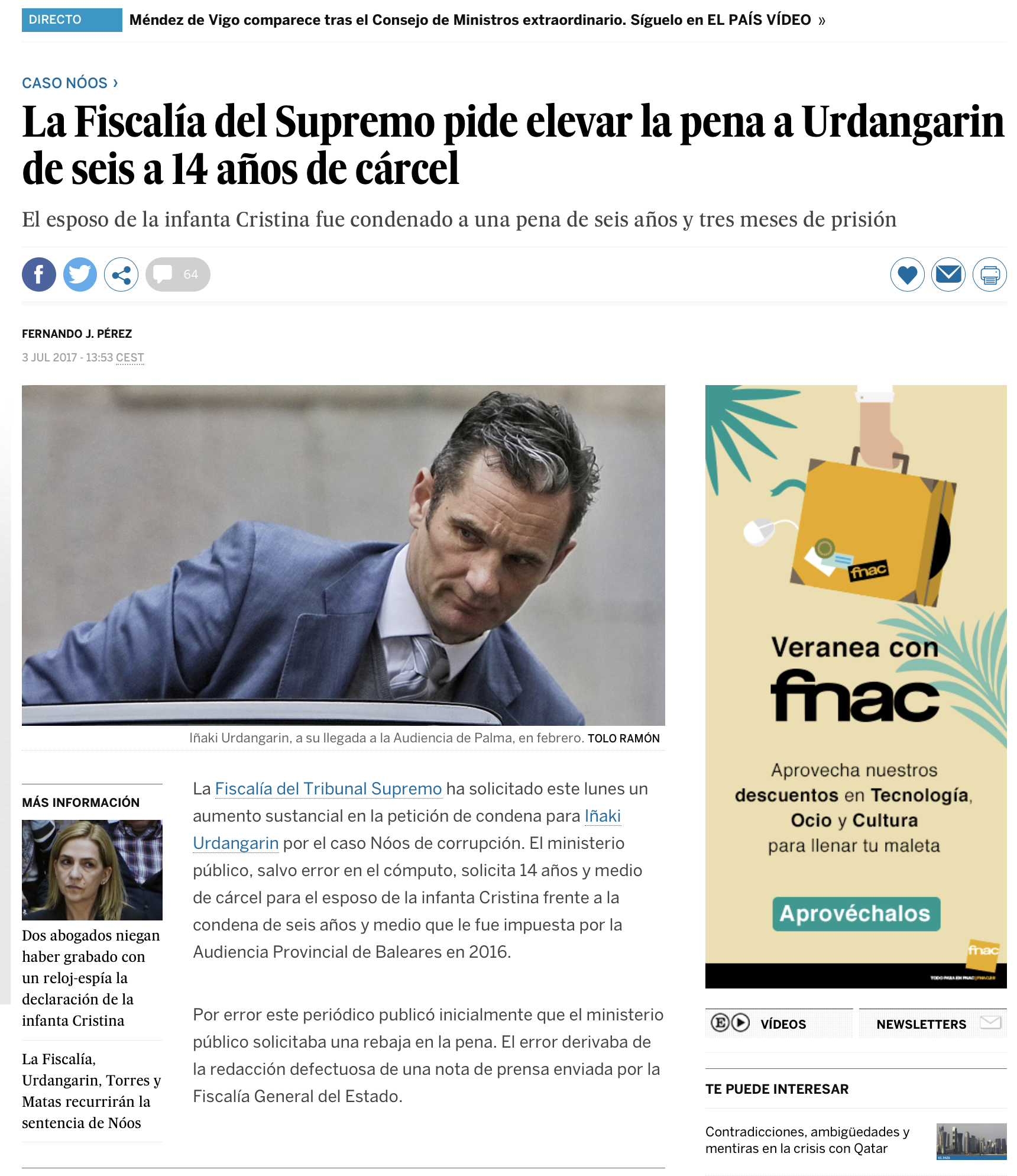 Madrid, 9 de julio del 2017.- El concepto informativo de «urgente» o «última hora» en los medios de información, prensa, radio y televisión ha perdido su función. Todos recibimos la misma alerta en los móviles, en la redes de mensajería y en la redes sociales, antes que leerlo en un medio de información tradicional. Si a esta ceremonia reiterativa le sumamos el error, el resultado incide directamente sobre el prestigio del medio y su alejamiento preocupante de la veracidad. Al primer periódico de España no le debería ocurrir esto: